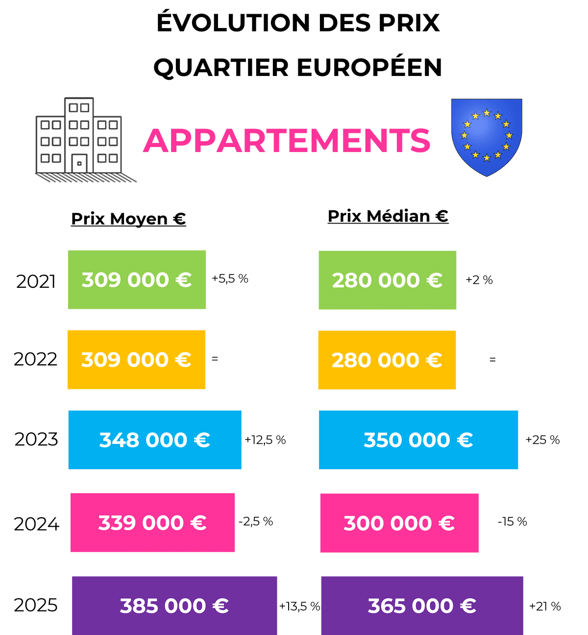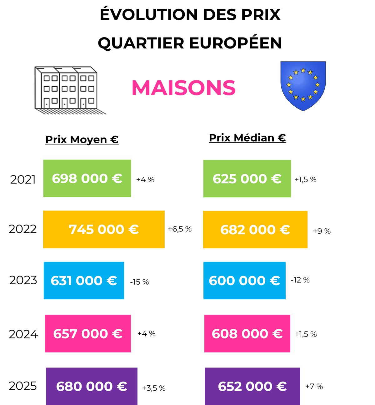 Depuis 2023, le nombre de transactions de vente de maison dans le Quartier Européen ont fortement diminué avec comme conséquence un impact à la hausse sur les prix de l'immobilier. En effet, le prix moyen observé en 2025 était de 680.000 € (+7,5 % par rapport à 2023), pour un prix médian à 652.000 €. 50 % des ventes de maisons ont été réalisées à un prix compris entre 550.000 et 850.000 €.